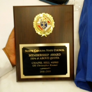 The Paul J. Trageser Council 10910 Knights of Columbus in Chapel Hill, NC is one of 17,000 Knights of Columbus Councils that make up the world’s largest Catholic fraternal service organization. Founded in 1882 to assist working-class and immigrant Catholics in the United States, today the approximately two million members of the Knights put their faith into action through a broad range of charitable causes locally, nationally and internationally with financial contributions and hands-on service.